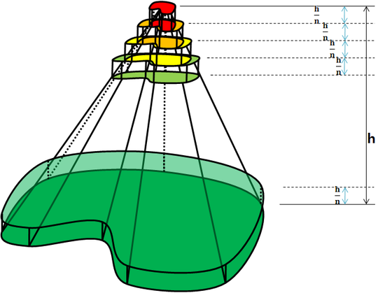 먼저 높이를 구해보겠습니다. 뿔을 n등분 했으므로, 각 요소들의 높이는 원래 높이의 1/n 배와 같습니다. (아래 그림)