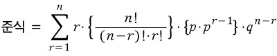 이제 이 식의 xi 대신에 이항분포를 따르는 확률변수 r을, pi 대신에 독립시행의 확률 nCr p^r q^{n-r} 을 대입하고, m에는 위에서 구한 기댓값인 np를 대입해봅시다.