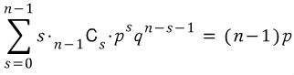위 확률분포의 평균은, 확률변수 s와 그에 해당하는 확률 P(X=s)를 각각 곱해서 모두 더해서 얻을 수 있는데, 그것은 바로 앞 수식에서 봤던 첫번째 시그마로 표현됩니다. 즉, 그 시그마의 결과는 이 이항분포 B(n-1, p)의 평균(=(n-1)p)이 되는 것입니다.