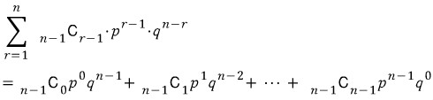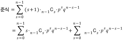 전개 결과, 확률이 p인 사건을 n-1회 반복하는 독립시행의 모든 확률을 더한 게 나옵니다. 다시말해서 이 전개식은 이항분포 B(n-1, p)를 따르는 확률변수가 취할 수 있는 모든 확률을 더한 것, 즉 가능성 있는 모든 확률의 총합을 의미하며, 그 값은 1이 됩니다.