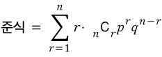 확률변수 r의 범위가 0부터 n까지임에 주목하세요. 이는, n번중 한 번도 안 일어날 수 있는 확률(r=0)과 n번중 n번 모두 일어날 확률(r=n)을 모두 고려하겠다는 뜻입니다. 그런데 r이 0일 때에는 시그마 부호 속의 첫번째 항이 사라지므로, 위 식은 r=1부터 계산해도 됩니다.